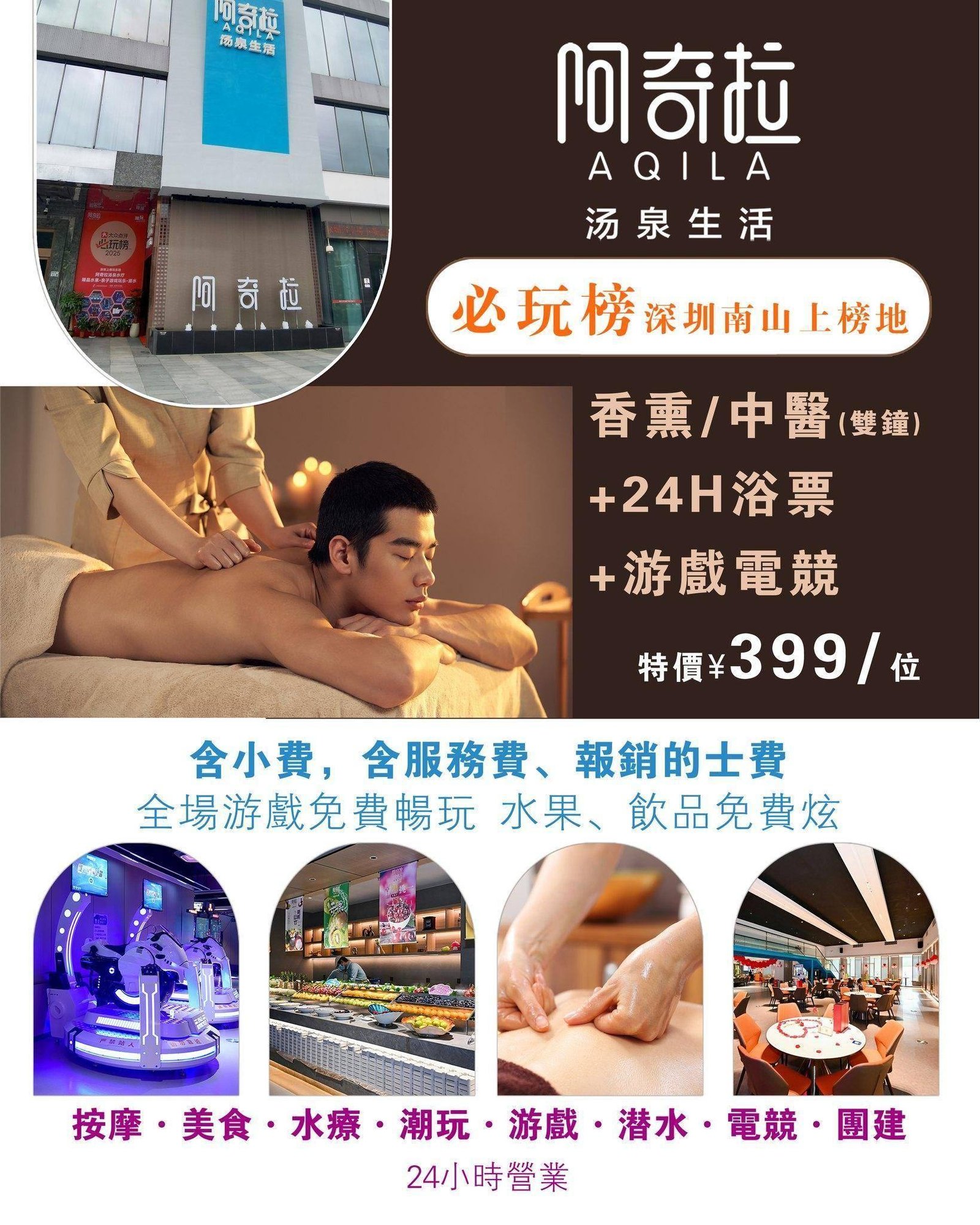深圳阿奇拉湯泉生活是一處融合現代設計與自然療癒理念的城市休閒地。這裡打造了集泡浴、康養、餐飲與社交於一體的複合空間。泉水質地純淨,搭配不同功能的泡池(如草本池、按摩池),能有效舒緩壓力。室內環境以極簡美學為基調,運用原木、石材等自然元素,營造出靜謐而高級的氛圍。此外,還提供特色茶歇、SPA護理及私人休憩艙,滿足都市人短暫「逃離」快節奏生活的需求。
